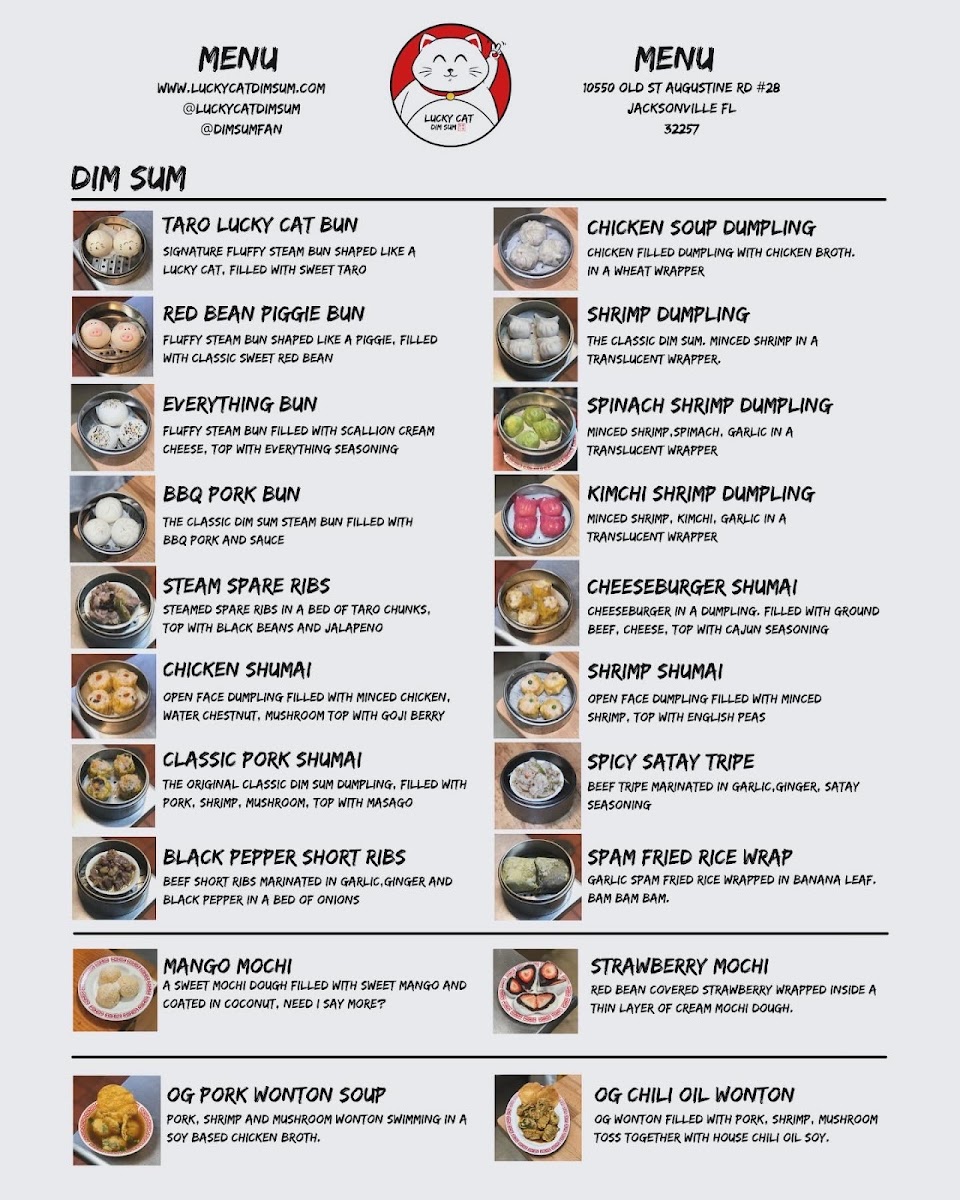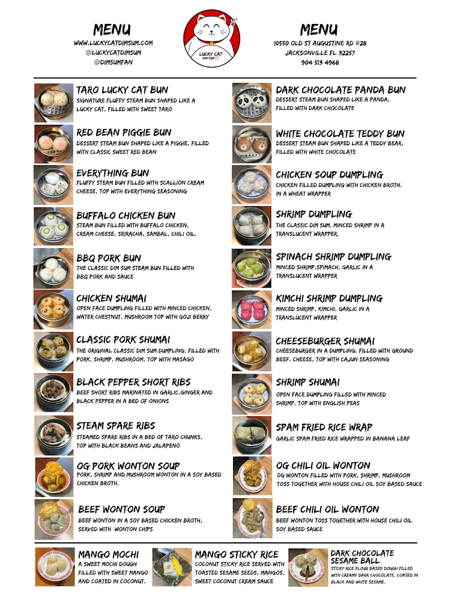 At Lucky Cat Dim Sum Restaurant, the culinary journey is steeped in tradition and infused with innovation. Nestled in The Crossroads at Mandarin in Jacksonville, FL, this hidden gem delights patrons with a diverse range of dim sum offerings. From the whimsical Taro Lucky Cat Bun to savory Chicken Shu Mai, every dish is crafted with care and bursting with flavor. The inviting atmosphere is complemented by friendly service, making each visit feel special. Diners rave about the freshness and creativity of the menu, while the unique Tea Lemonade adds a refreshing twist to the experience. Discover your new favorite dim sum destination at Lucky Cat!
