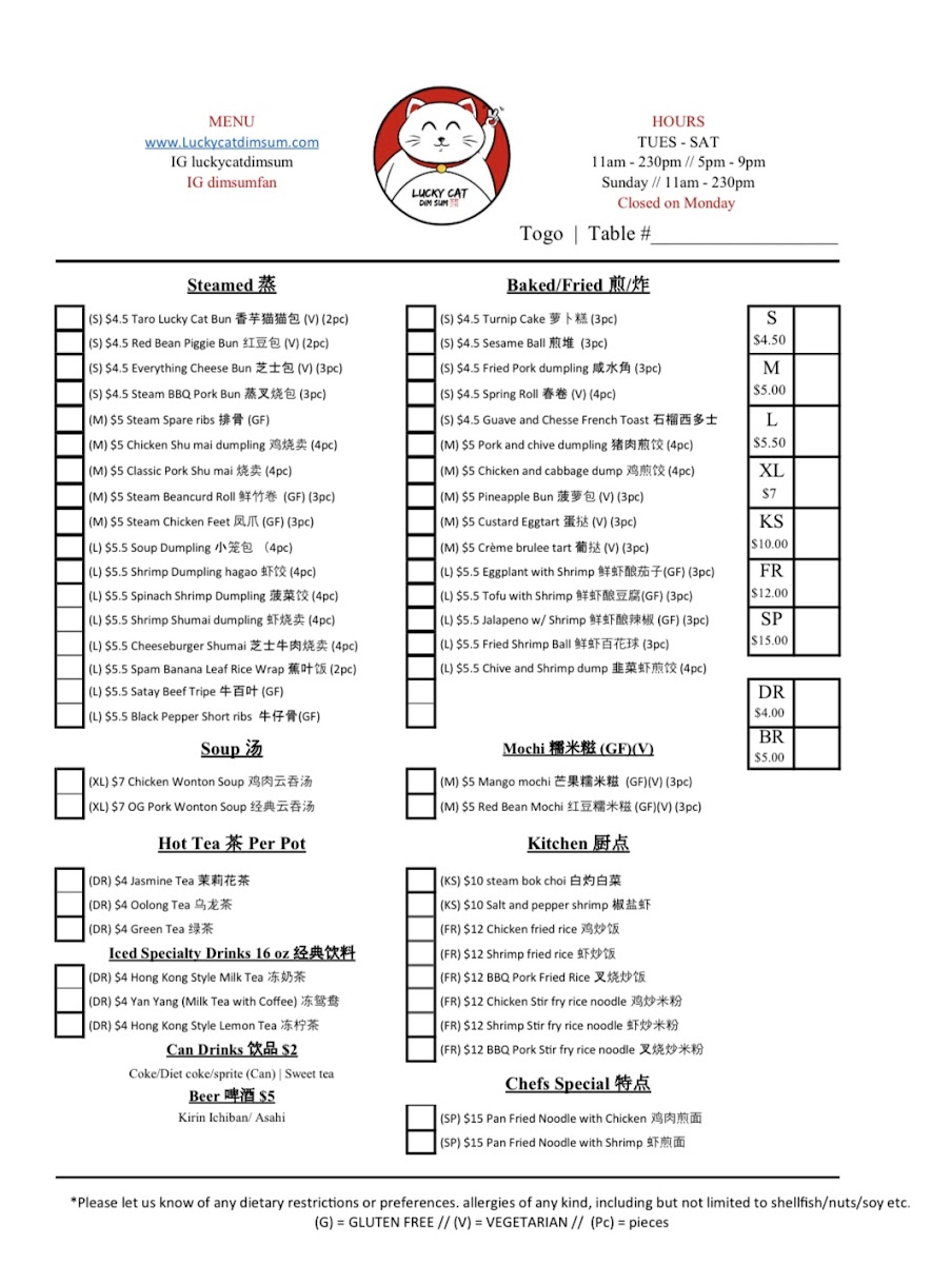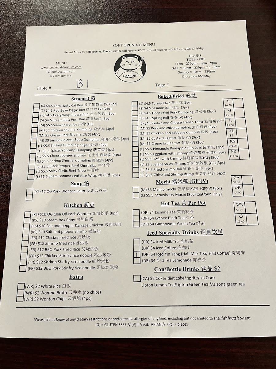 “ Lucky Cat is a fantastic spot for dim sum lovers! The environment is warm and inviting, making it a great place to enjoy a meal with friends or family. The customer service is excellent—friendly and attentive staff who make you feel welcome from the moment you walk in. Now, let’s talk about the food—the dim sum is absolutely amazing! Every bite is packed with flavor, perfectly crafted, and served fresh. Whether you're a fan of dumplings, bao, or other dim sum classics, you won’t be disappointed. One thing you must try before leaving is their Tea Lemonade. It’s a refreshing, flavorful drink that perfectly complements the meal. Overall, Lucky Cat is a must-visit for anyone who loves dim sum and great service. Highly recommended! ”